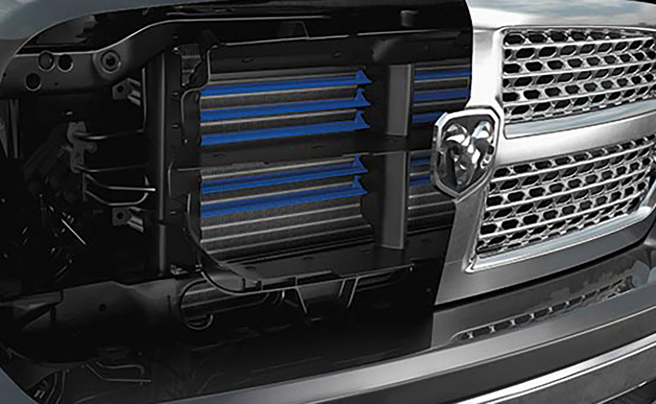 The RAM 1500 range breathes on its own! It comes standard with ActiveAir® Grille shutters, which block front-end airflow openings to reduce drag while maintaining optimal engine temperatures. Reduced drag helps improve efficiency. These shutters open and close automatically, based on various inputs from the vehicle. For example, when a vehicle is travelling at highway speeds and producing moderate engine temperatures, the shutters are closed, which directs airflow around the vehicle to reduce drag and improve efficiency. When the vehicle is operating in heavy stop-and-go traffic or pulling a trailer, the shutters remain fully open to allow air to flow into the engine compartment for optimal engine cooling.