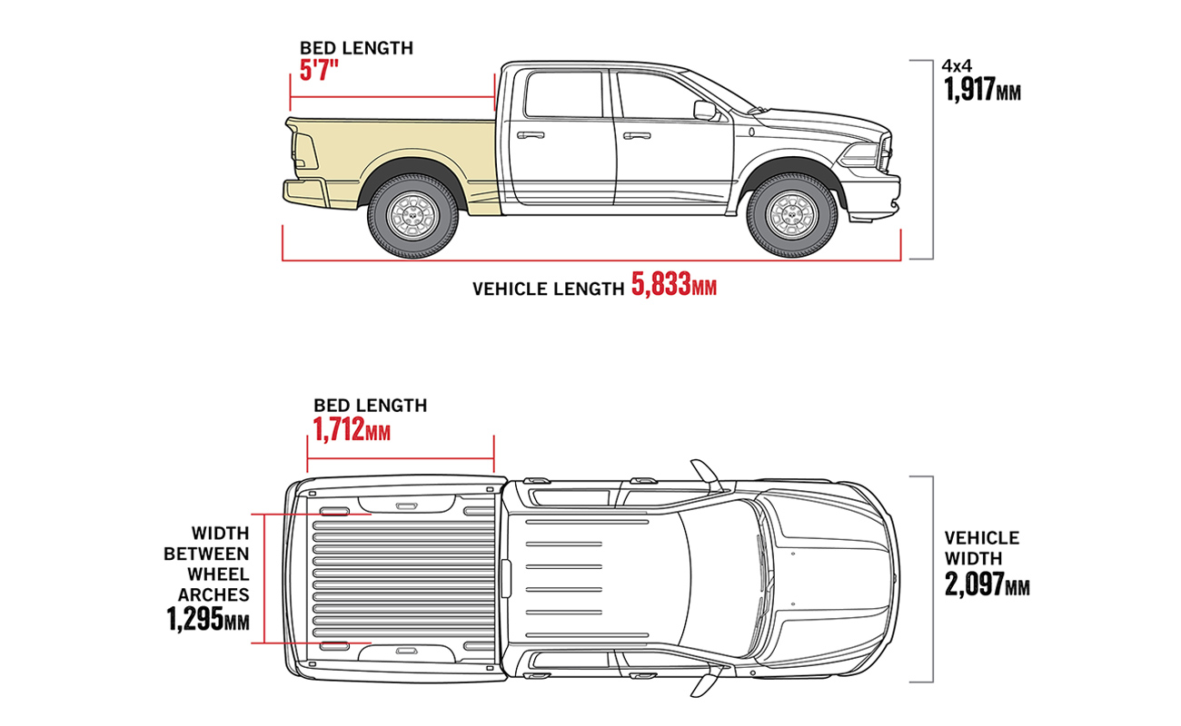The Express standard tub will take a full-size pallet with ease and you’ll still have space left over, thanks to the cargo tub length of 1,712mm, and a width between the wheel arches of 1,295mm. No corners have been cut, no sacrifices made. Just one smart package that’s been purpose-built with the flexibility to undertake any challenge. The RAM 1500 Express®, will impress!